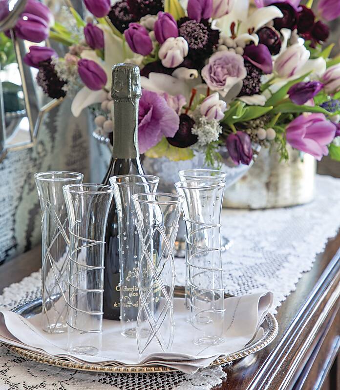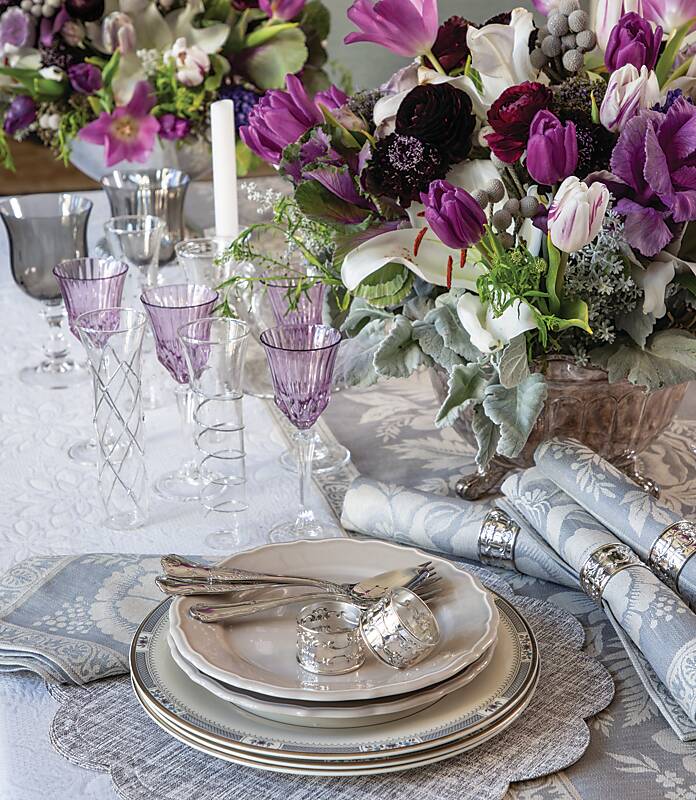 Creamy bone china edged in steel hues and dainty buds nods to the bright flowers that enliven the scene. A footed planter spills forth a spectrum of purple that includes tulips, lilies, ranunculus, carnations, spray roses, scabiosa, and hyacinth, along with Brunia, pussy willow, and dusty miller. Scalloped place mats call to mind snowflakes, as swirled embellishments on napkin rings and flatware reflect flurries dancing on blustery breezes.