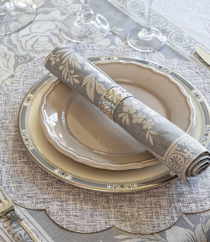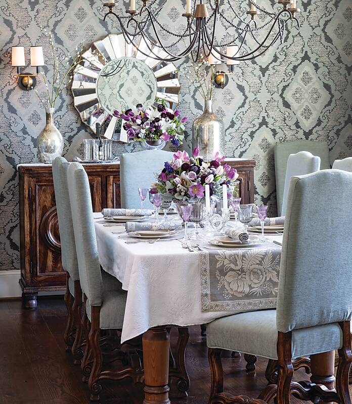 Cast January’s gray shades in a new light, pairing them with luminous silver for an elegant presentation. A floral-embossed tablecloth makes a fitting backdrop, while a runner and matching napkins in a vintage jacquard print coalesce in a soft pattern play. Tinted glassware and mismatched Champagne flutes round out the look.