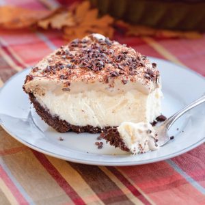 3. To prepare topping: In a medium bowl, combine cream and espresso powder. Beat at medium-high speed with an electric mixer until soft peaks form. Beat in confectioners’ sugar until stiff peaks form. Spread cream mixture over pie filling. Garnish with grated chocolate and cacao beans, if desired.